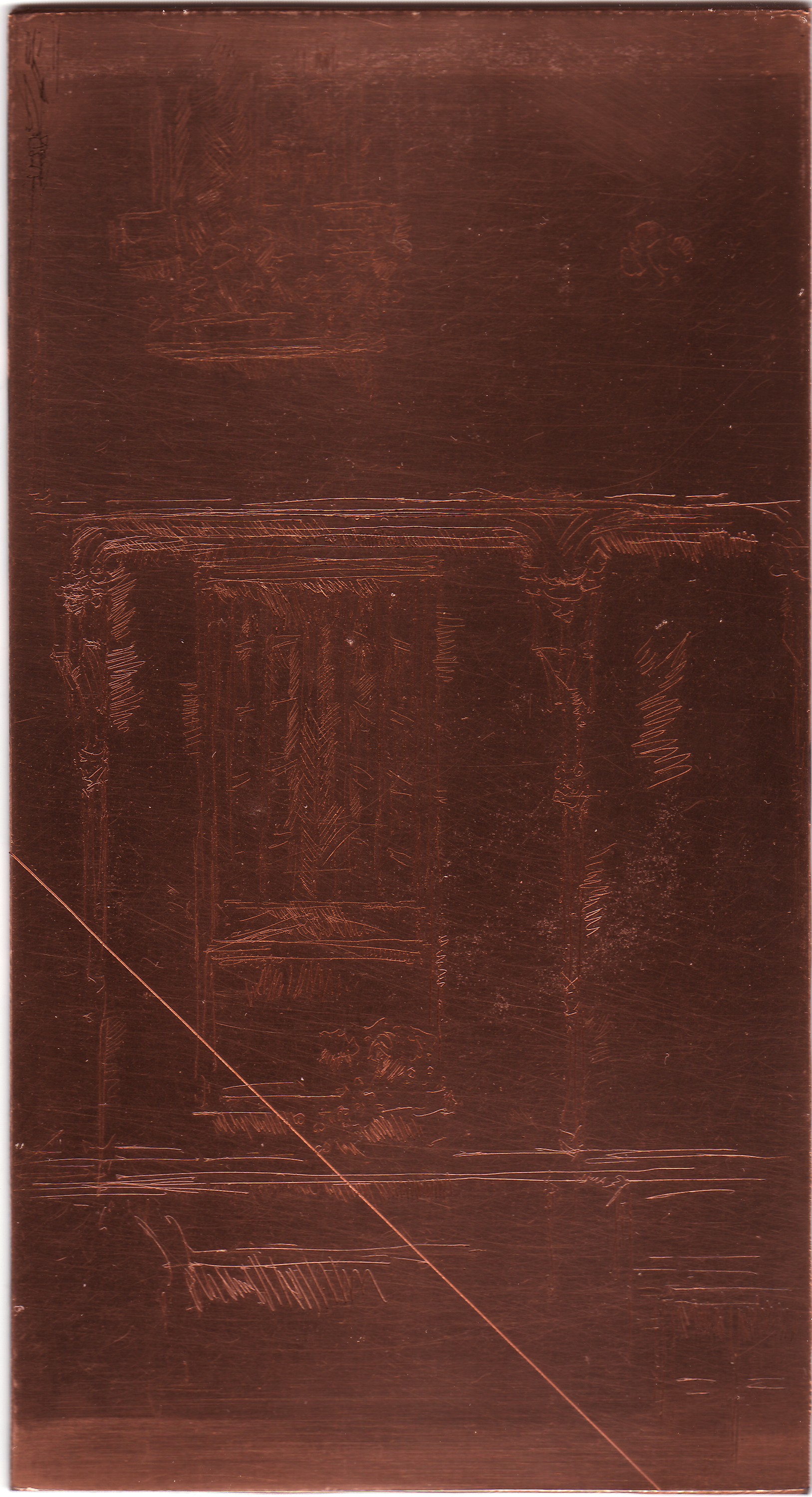 This is a digital image based on the copper plate. A scan of the copper plate was flipped horizontally, converted to greyscale, and colour inverted, with enhanced contrast.